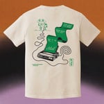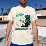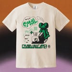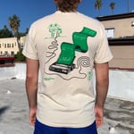 100% ring spun cotton, ivory colored shirt with 2 color screen print on front + back.
